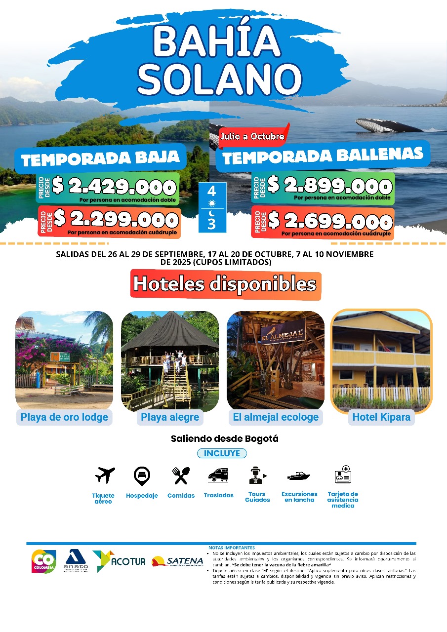 Tiquete aéreo Bogotá – Bahía Solano – Bogotá (Escala en Medellín o Quibdó) vía Satena en clase “M”. (Aplica suplemento para otras clases tarifarias).