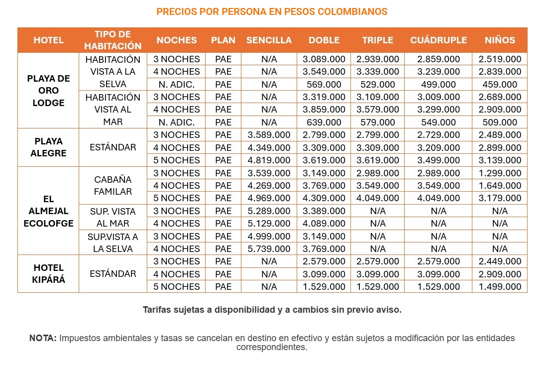HOTEL EL ALMEJAL: Cabañas estándar independientes con baño privado y ventilador; ubicadas en la parte baja del Lodge. Habitación superior: ubicada en la parte alta del hotel, se deben subir 85 escaleras para llegar, tiene baño a cielo abierto y la ducha cae en forma de cascada. Son con aire acondicionado (Solo para acomodación doble, sujeto a disponibilidad).